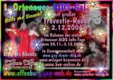 TIP: 1. Ortenauer AIDS-Benefiz-Gala Am 2. Dezember 2006 in Lahr mit großer Travestieshow und weiteren Künstlern... Sie findet vom 24.11. bis 3.12.2006) im Rahmen des Welt-AIDS-Tages statt. Es wird eine große Show mit schwulem Männerchor, Travestie, u.v.m. geben. Illustre Showstars sind angesagt, es wird provokante und (für die Heten hier sicher) „anstößige" Aufklärung mit Unterstützung der Schwestern der perpetuellen Indulgenz betrieben und dazu laden wir schon jetzt alle Szeneasten, Interessierten und Neugieren ganz herzlich ein, denn im Schwarzwald gibt es nicht nur Pollenhüte, sondern auch gaymeinschaftliches Handeln in und mit der Szene. Infos hier: 1. Ortenauer AIDS-Benefiz-Gala